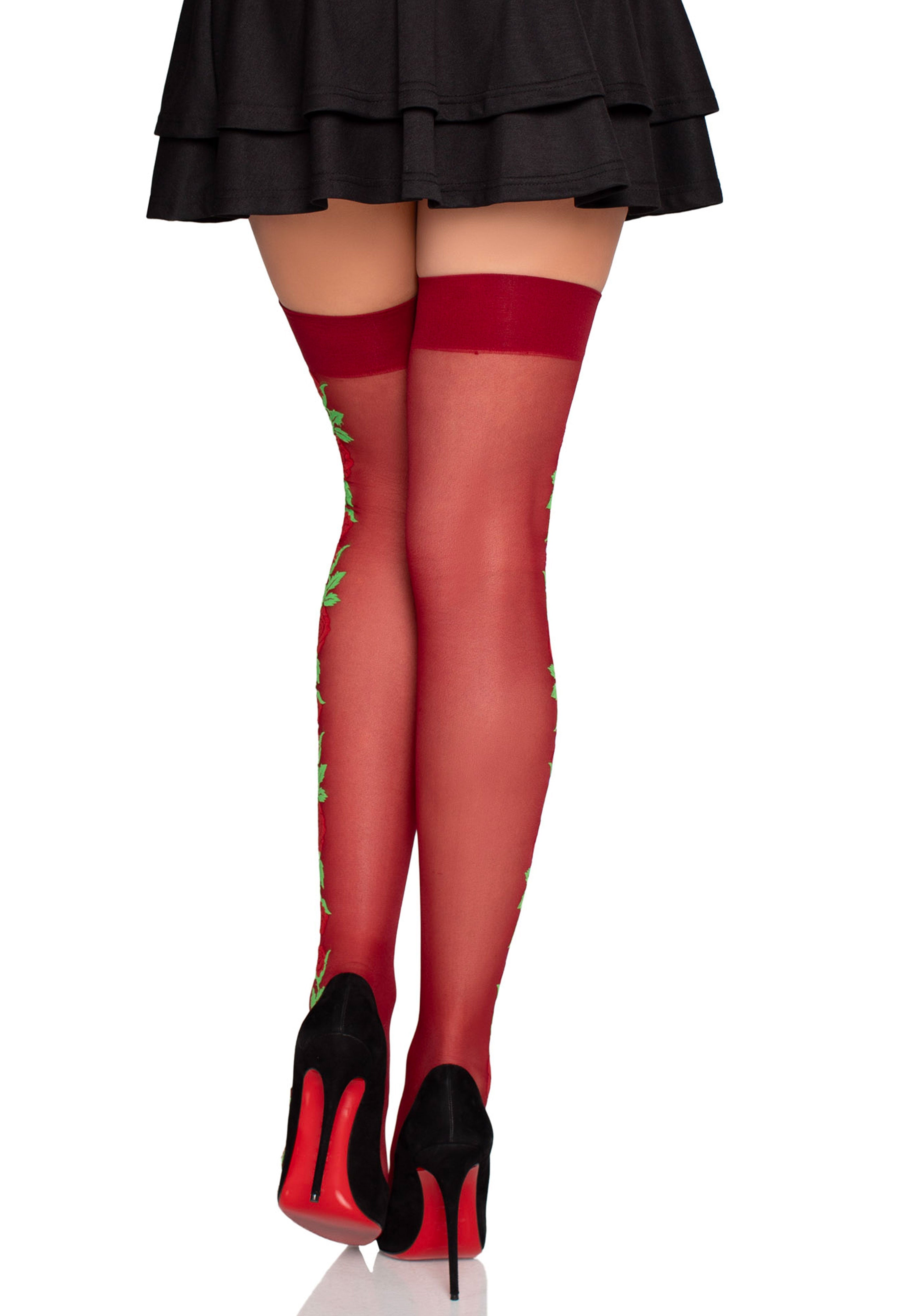 Add a touch of romance with these Bordeaux Sheer Thigh Highs with Embroidered Rose Side Details. Made from a luxurious spandex-blend fiber, they offer a soft, stretchy fit with a hint of shine. The red and green embroidered roses along the side add a flirty, feminine touch, making these thigh highs the perfect finishing detail for any bold and playful look.